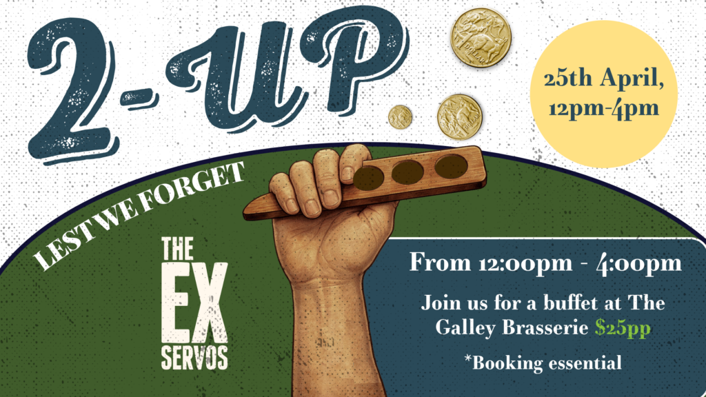 We’re honoured and excited to be hosting our annual 2-Up this ANZAC Day from 12pm – 4pm. Featuring a delicious buffet lunch at The Galley Brasserie for just $25pp. Book in to secure your table!